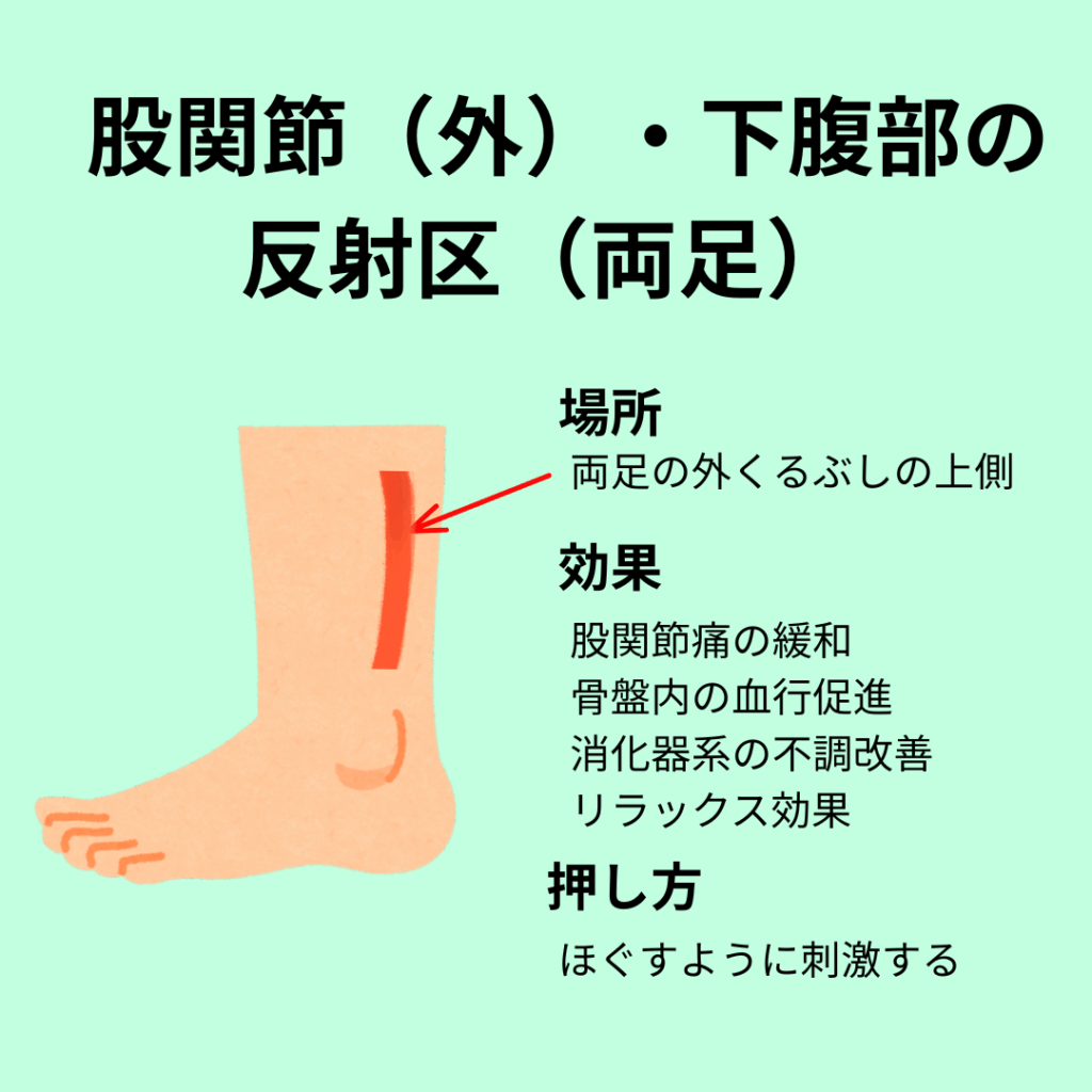 足の外側、くるぶしの上部あたりには、股関節(外側)や下腹部に対応する反射区があります。